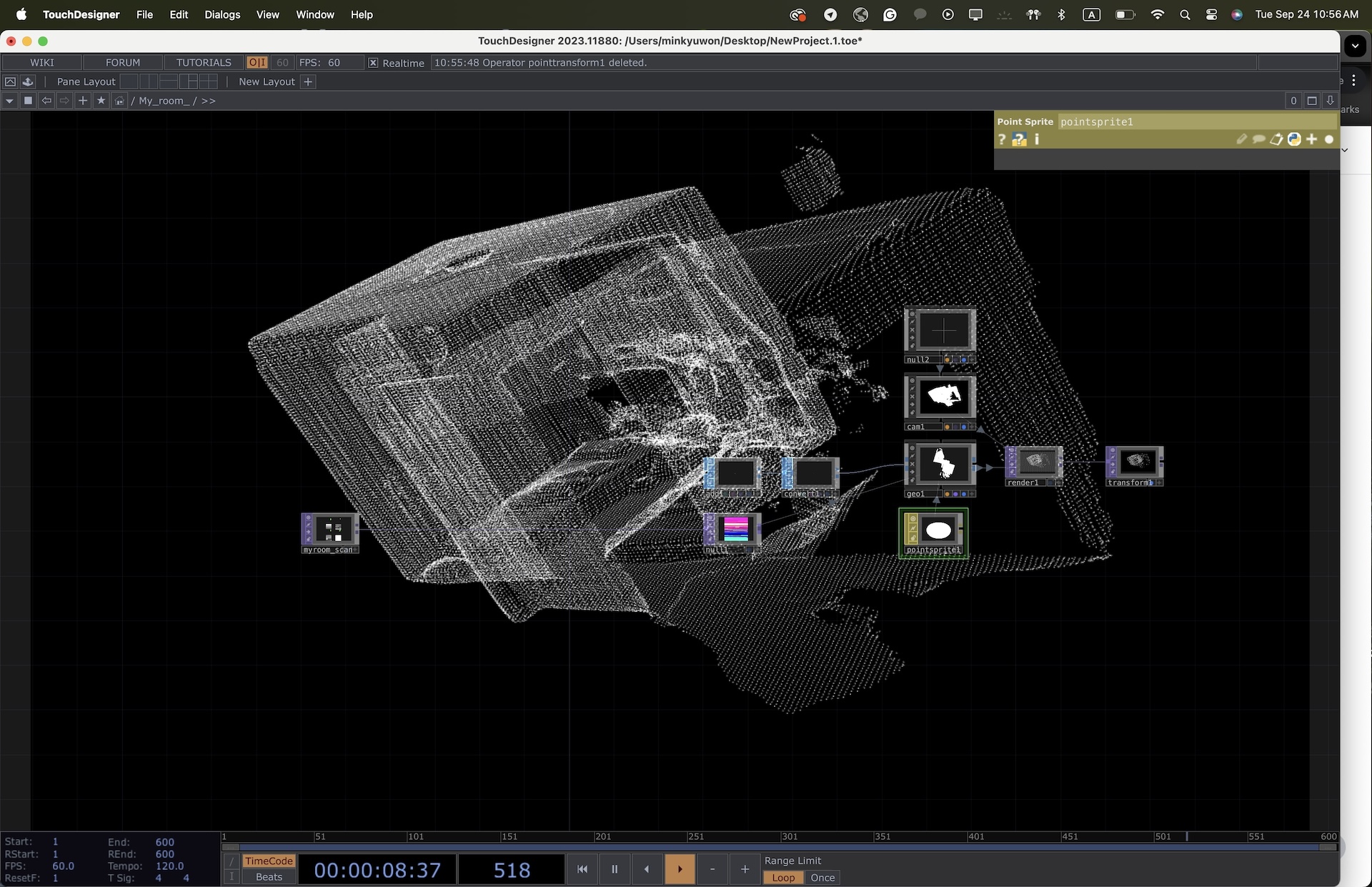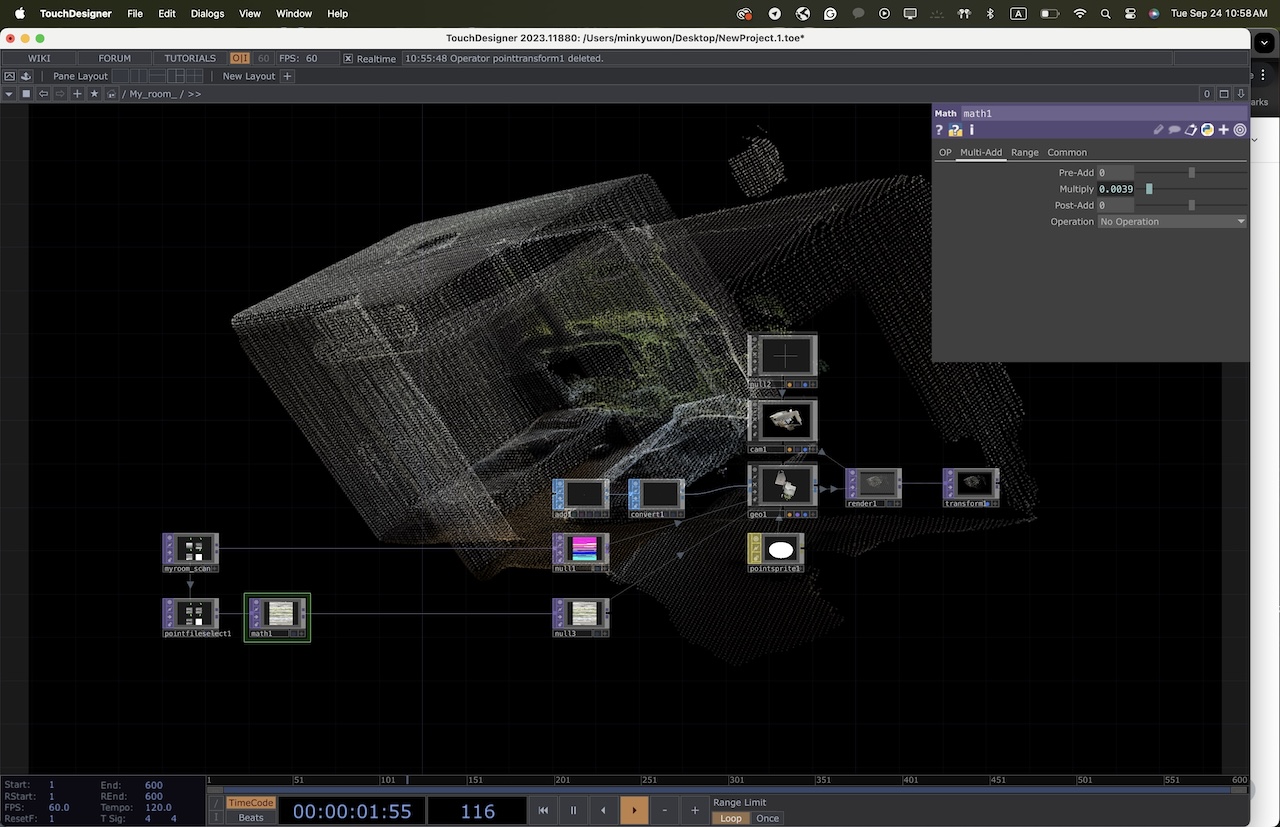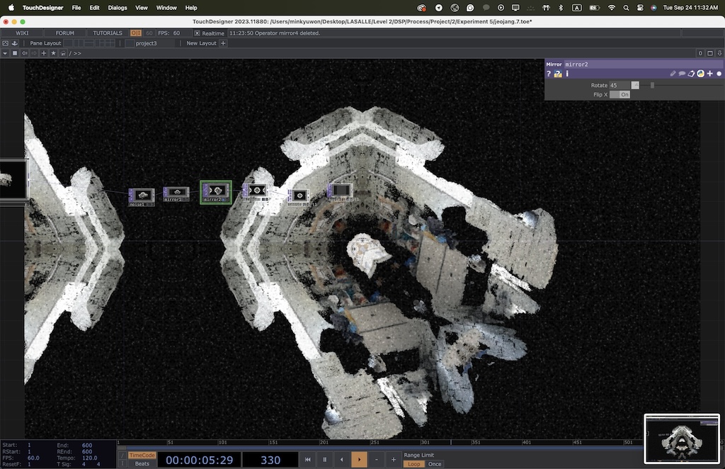 * Link to Referred Tutorial - After scanning, we imported the models into TouchDesigner for processing. We applied transformations (e.g., distort, mirror, scatter) in response to specific voice commands. The abstract transformations mimicked the shifting, dreamlike qualities of controlling one's dream landscape.