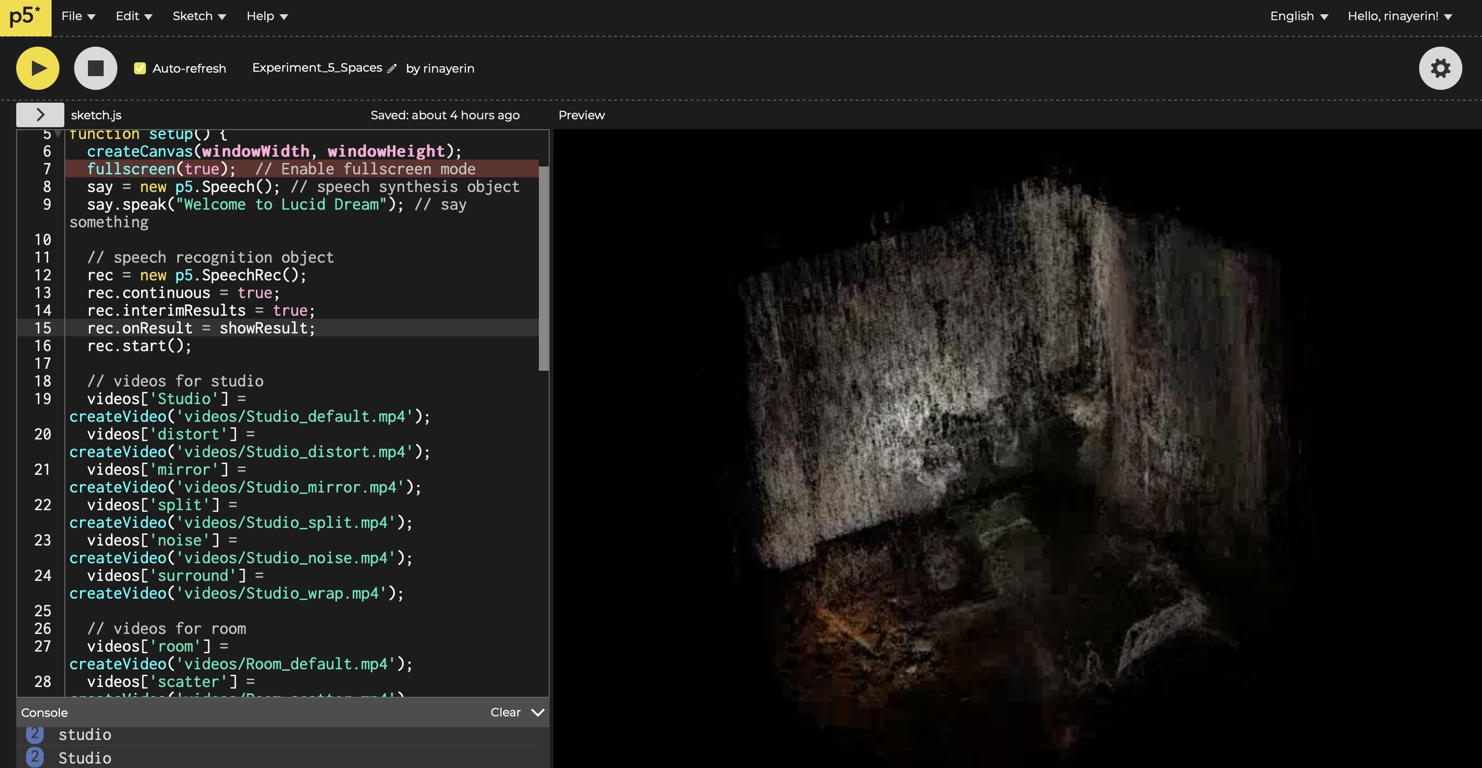 We used speech recognition to capture the user's voice, triggering corresponding visual transformations. Commands such as “distort,” “mirror,” or “scatter” would modify the visual spaces, which were originally scanned 3D environments like classrooms and bedrooms. These visuals, exported from TouchDesigner, were integrated into p5.js and played as videos that changed based on the spoken commands. This interaction gave users the feeling of reshaping their surroundings in real time, much like controlling the landscapes in a dream.