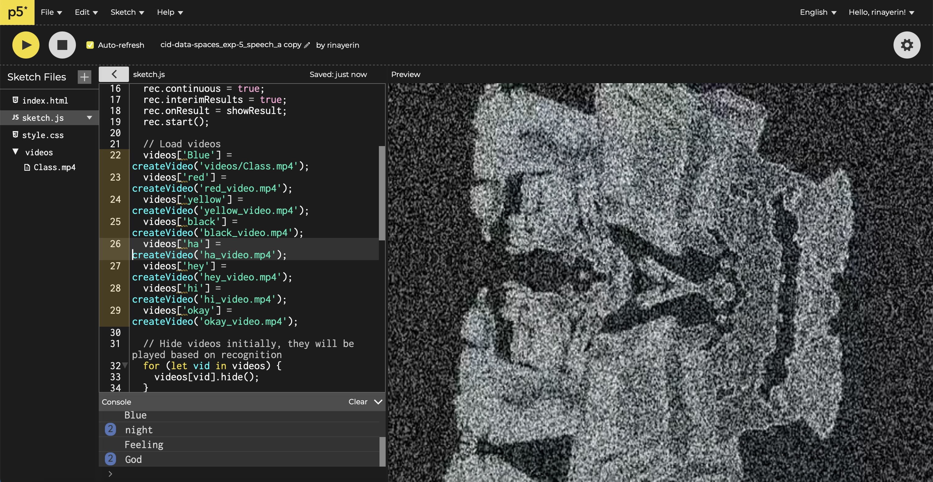 * Link to the sketch - we used speech recognition to capture the user’s voice and trigger the corresponding visual changes. With p5.js we made visual responses played as videos that changed dynamically based on the spoken commands.